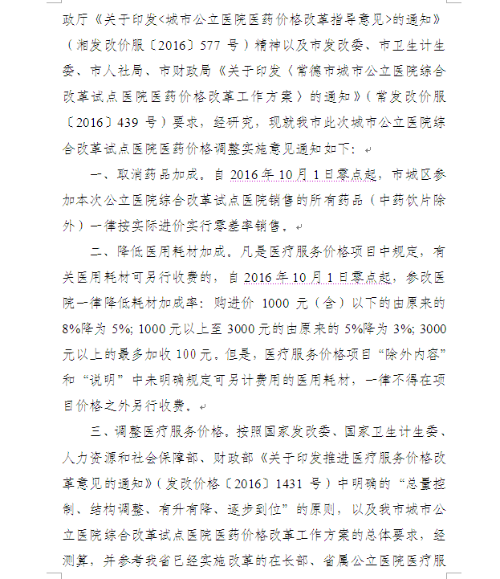 关于我市城市公立医院综合改革试点医院医药价格调整实施意见的通知