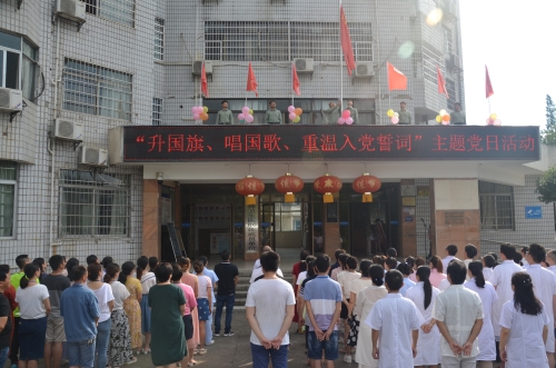 活动由纪检员兼工会主席刘宁同志主持,党总支书记魏云同志、院长王丽群同志和其他班子成员、全体党员、部分职工一起参加了此次活动。8点整活动准时开始,首先举行了“升国旗、唱国歌”仪式,伴随着雄壮豪迈的音乐,现场的党员、职工饱含深情地大声唱起国歌,鲜红的五星红旗在医院上空冉冉升起。接着,党总支书记魏云同志带领全体党员举起右手,庄严宣誓,重温了入党誓词。最后,魏云同志表示此次活动既是庆祝建党97周年的主题党日活动,也是激发全院党员、干部、职工爱党、爱国、爱院情怀和增强医院凝聚力的重要形式,希望全体党员要时时刻刻以一名共产党员的标准严格要求自己,并号召全院干部职工以良好的精神面貌、饱满的工作热情、严明的组织纪律共同推动医院各项工作更上新的台阶。